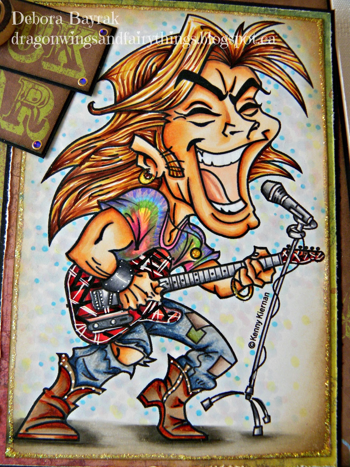On my husbands request I colored the guitar like Eddy Van Halen's guitar. As I googled many images of Eddy and his guitar I wondered if he ever wore a shirt?! The very first concert I ever went to was a Van Halen concert when I was 15.